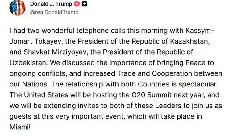 «Questa mattina ho avuto due meravigliose conversazioni telefoniche con Kassym-Jomart Tokayev, Presidente della Repubblica del Kazakistan, e Shavkat Mirziyoyev, Presidente della Repubblica dell'Uzbekistan. Abbiamo discusso l'importanza di stabilire la pace nei conflitti attuali, nonché l'espansione del commercio e della cooperazione tra i nostri paesi. Le relazioni con entrambi i paesi sono eccellenti. L'anno prossimo gli Stati Uniti ospiteranno il vertice del G20, e invieremo a entrambi i leader inviti a unirsi a noi come ospiti a questo evento molto importante, che si terrà a Miami!», si legge nel post di Trump.